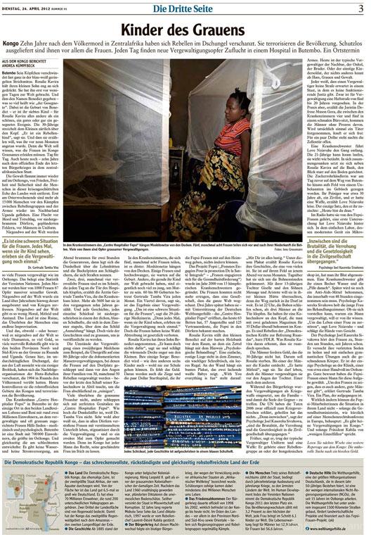 Rosalie Kavira stillt den kleinen Benedict auf der harten Holzbank vor dem Raum, an dem ein Zettel hängt mit dem Hinweis „Psychologische Behandlung“. Eine einfache, rostige Liege steht in dem Zimmer, ein wackliger Schreibtisch, ein leeres Regal. An der Wand hängt ein buntes Plakat, das zwei lachende weiße Babys zeigt. „With You everything is fun“ steht darauf: „Mit Dir ist alles lustig.“ Unter diesem Plakat erzählt Rosalie Kavira ihre Geschichte, die eine von vielen ist. Sie ist auf ihrem Feld an jenem Abend vor neun Monaten. Tagsüber hat sie sich um die Bohnenstauden gekümmert. Mit ihrer 13-jährigen Tochter Giselle und den Söhnen Message und Aristote will sie in ihrer kleinen Hütte übernachten, denn der Weg zurück in ihr Dorf ist weit. Es ist 22 Uhr, die Jungen schlafen schon, als drei Männer an die Tür klopfen. Sie halten ihr eine Kalaschnikow an den Kopf, die man überall im Kongo mit zwei geladenen Magazinen für 35 Dollar bekommt. Es sind Rebellen der „Demokratischen Kräfte zur Befreiung Ruandas“, kurz FDLR. Das erkennt Rosalie Kavira daran, dass sie Ruandisch sprechen.